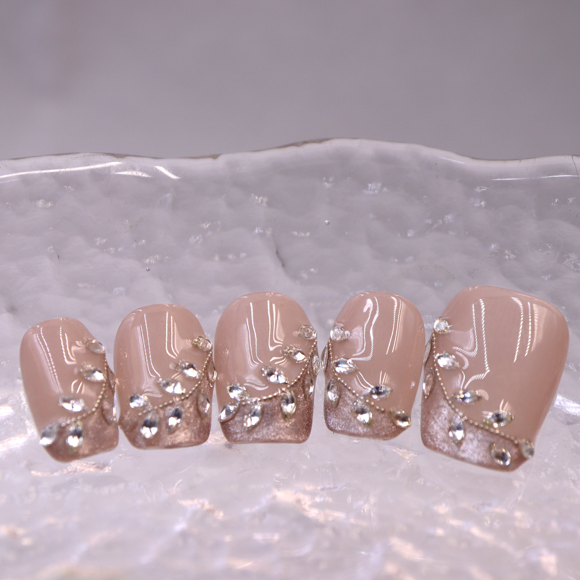 A nude base paired with shimmering gold tips, highlighted by cascading rhinestone leaf patterns. The fine chain-like detail adds a touch of refined glamour, ideal for both formal occasions and everyday luxury.