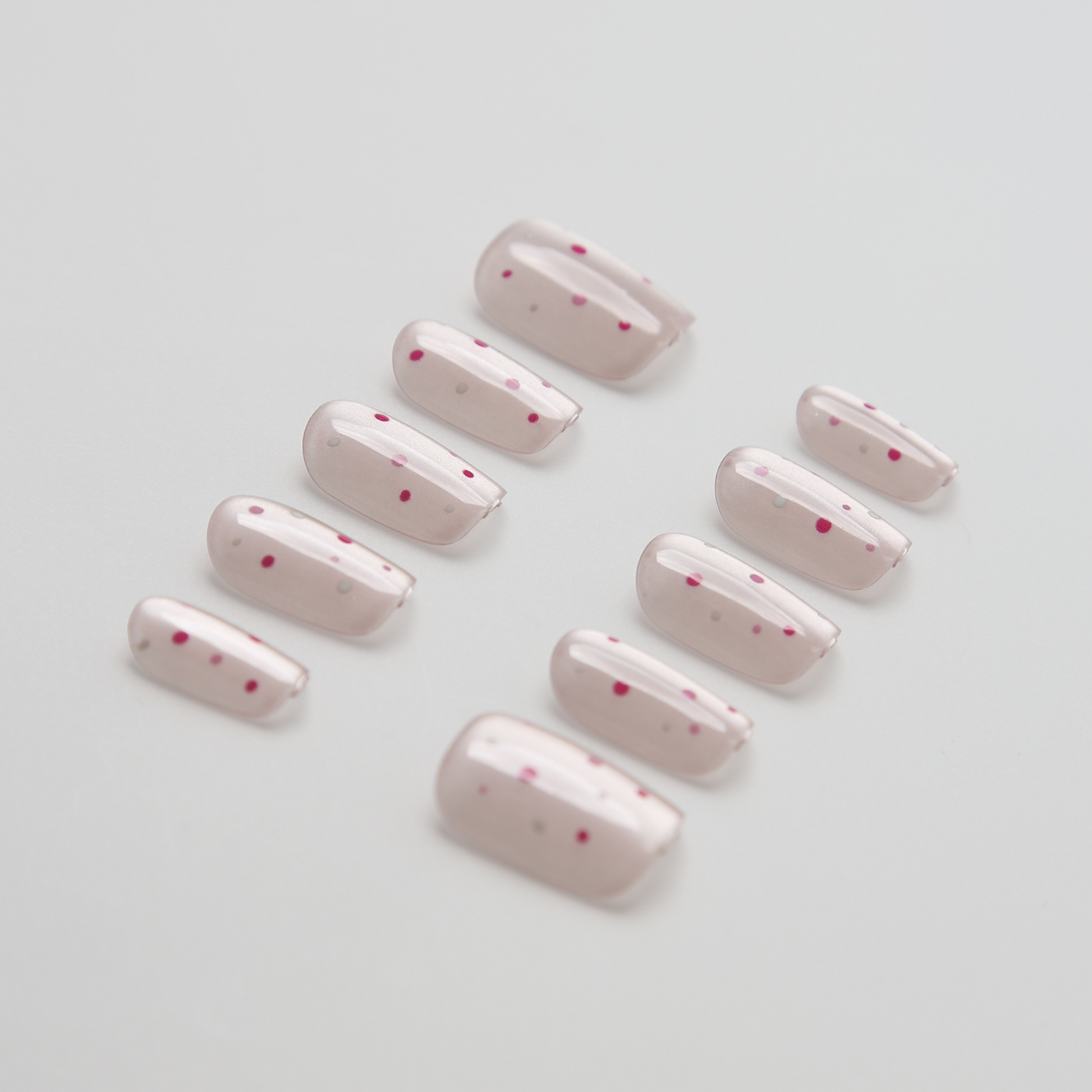 Subtle nude with scattered pink dot confetti—minimal, playful, and totally wearable.